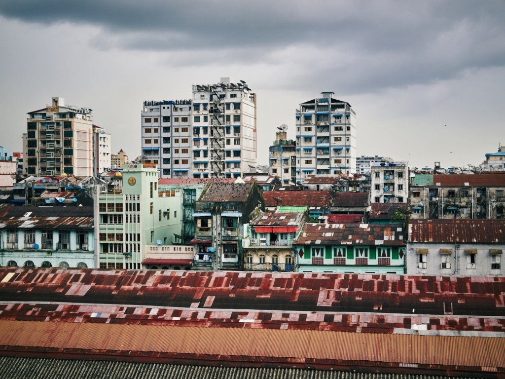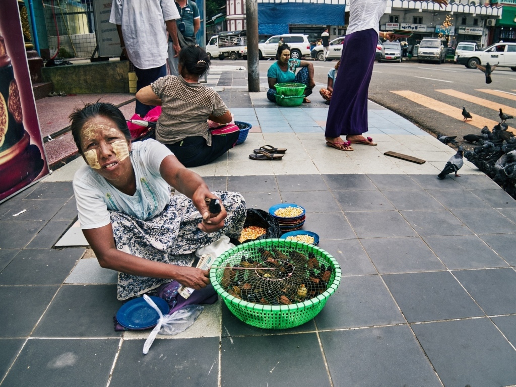 Rangun (Jangon) zamieszkuje ponad 7 mln mieszkańców. Dla mnie wizyta w tym mieście była czymś niewyobrażalnie silnym i nie zapomnę tego do końca życia. W mojej głowie nieustannie toczyła się wojna cywilizacji. Miejsce to może jednocześnie fascynować i przerażać. Z otwartym umysłem rządnym wrażeń i najchętniej zatkanym nosem, ruszyłem z aparatem w dłoni na jego ulice. Niestety, ze względu na napięty plan wycieczki, zdjęcia musiałem robić niemal w biegu. Dodatkowym utrudnieniem był stan chodników. Ich konstrukcja musi umożliwiać odprowadzanie dużych ilości wody w czasie ulew. Niestety czasy świetności mają za sobą i bywa, że brakuje w nich fragmentów na tyle dużych, że podczas chwili nieuwagi, można by zniknąć pod chodnikiem i skończyć w rynsztoku. Tak przy okazji nadmienię iż lipiec wydaje się być bardzo przyjemny do podróży w tym regionie. Deszcz ograniczał się do codziennej ulewy przez max godzinę. Pojawiał się jak zaprogramowany w okolicy 16ej.
